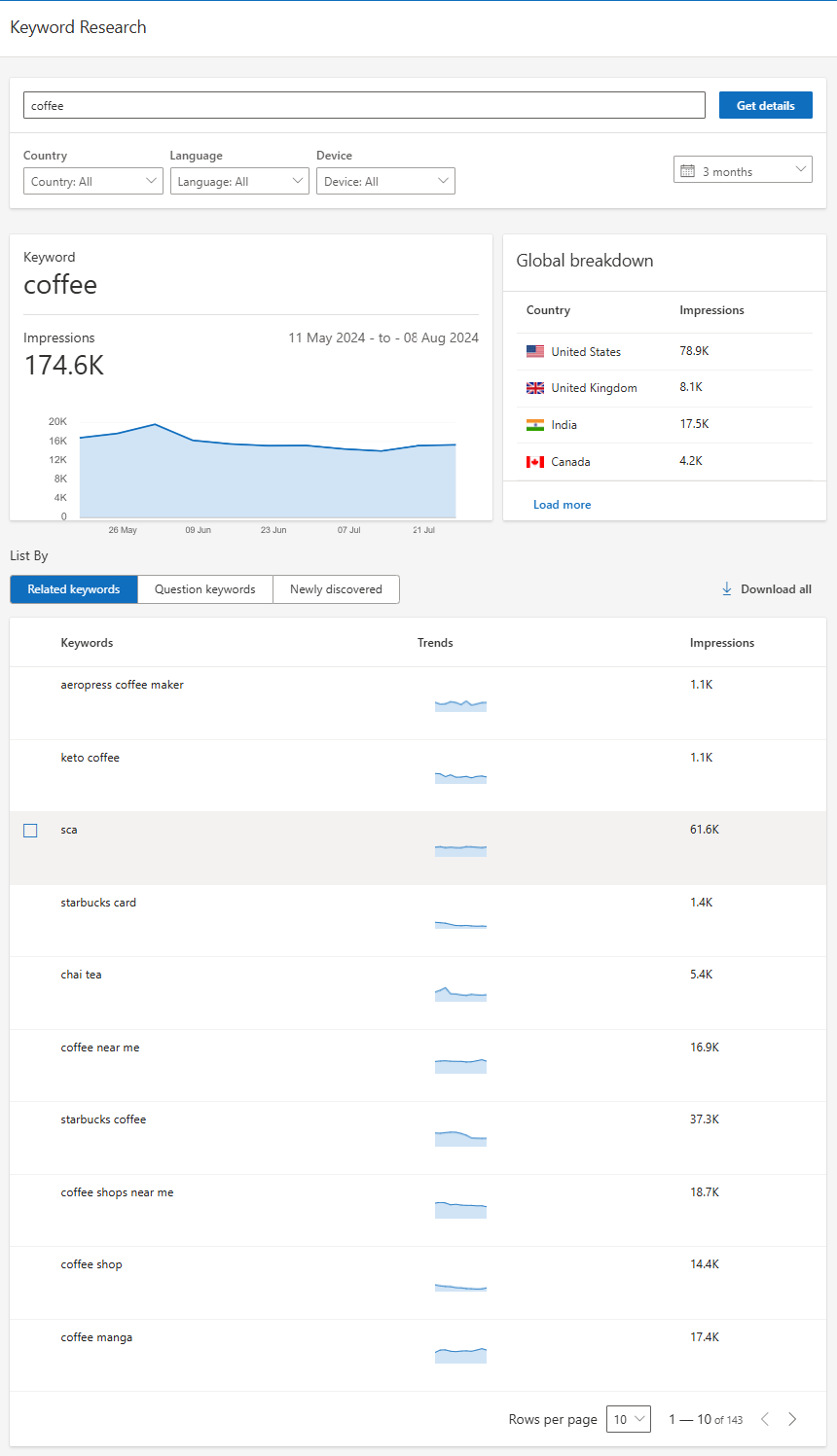 Tools that can help: The Keyword Research tool in Bing Webmaster Tools can help identify relevant and effective keywords for your niche or industry, while the Search Performance tab displays your average position for each keyword, along with the number of impressions, clicks, and click-through-rates (CTR) for each.