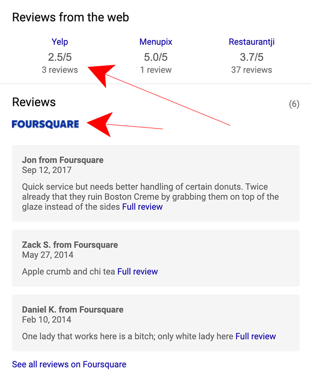 But I do not currently see Yelp reviews for many businesses right now. I do see it when I search for “Dunkin Donuts” but only under the “Reviews from the Web” which links me off Bing and onto Yelp. The section specific to reviews for Dunkin Donuts pulls from Foursquare. So I am not sure exactly if Yelp is fully removed or something else is going on.