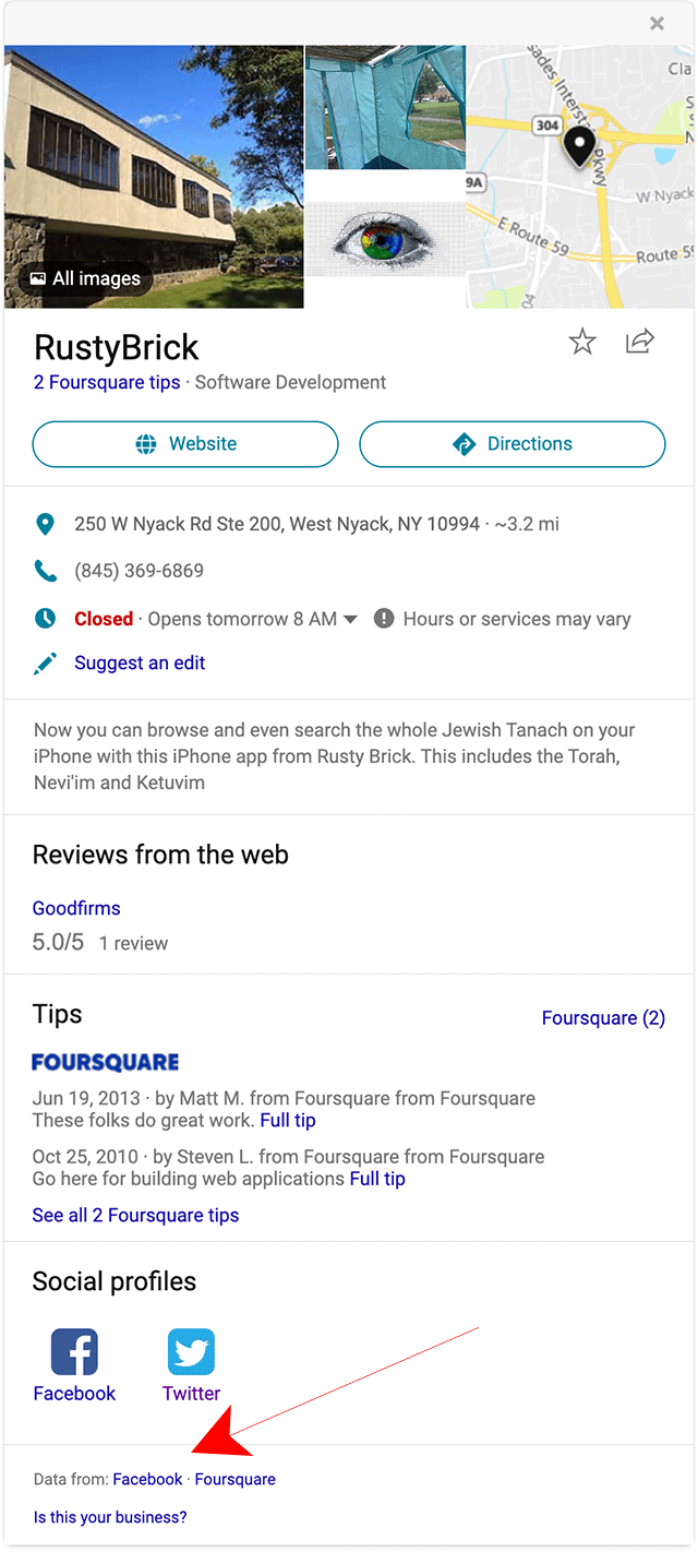 See the source links at the bottom of the local panel, it says “Data from: Facebook · Foursquare.” Keep in mind, I do have a verified listing in Bing Places.