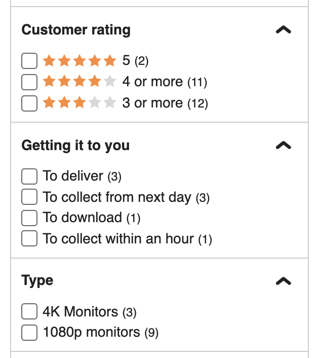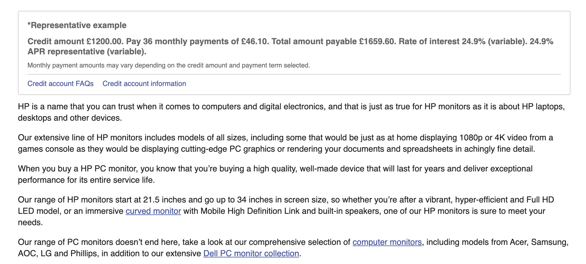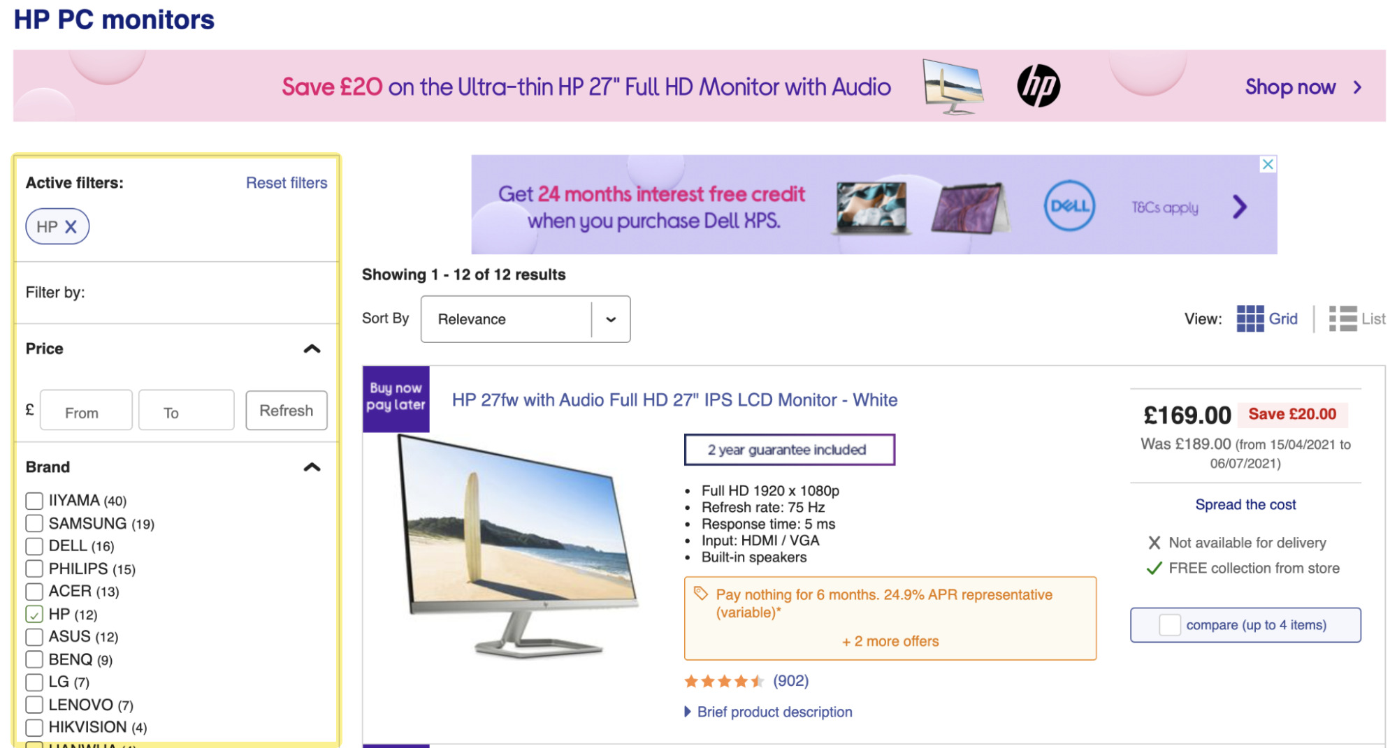 See the ecommerce site currys.co.uk as an example. We start on their HP PC Monitors page. It’s a reasonably standard ecommerce layout, with a header, listings, and faceted search above the fold: