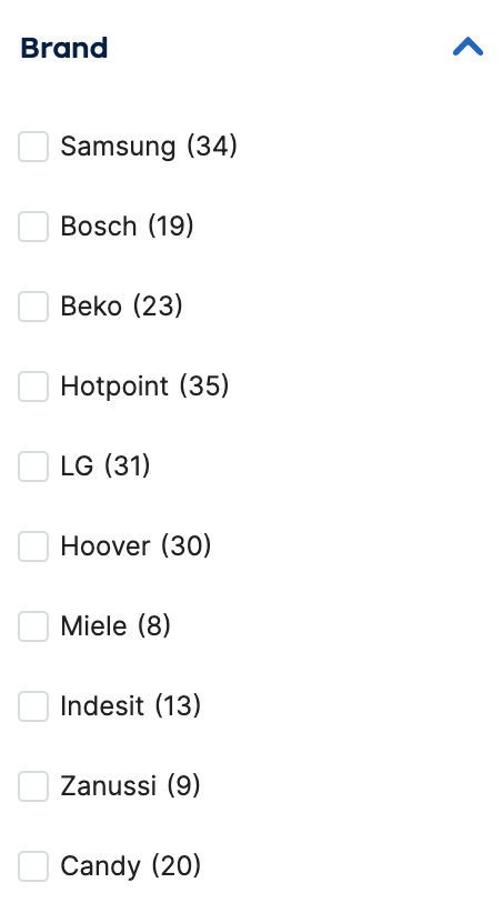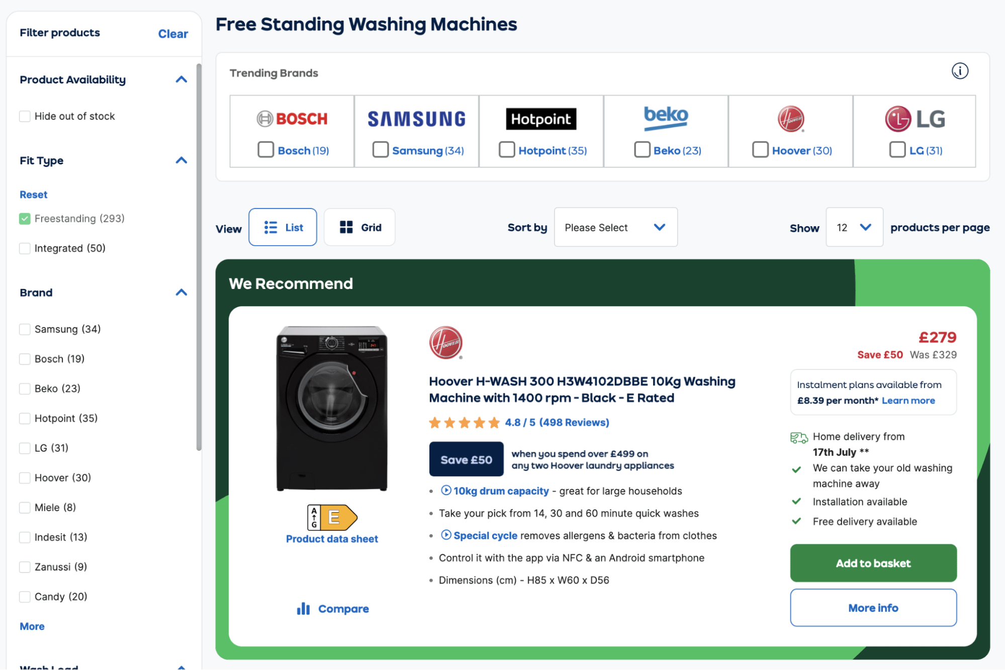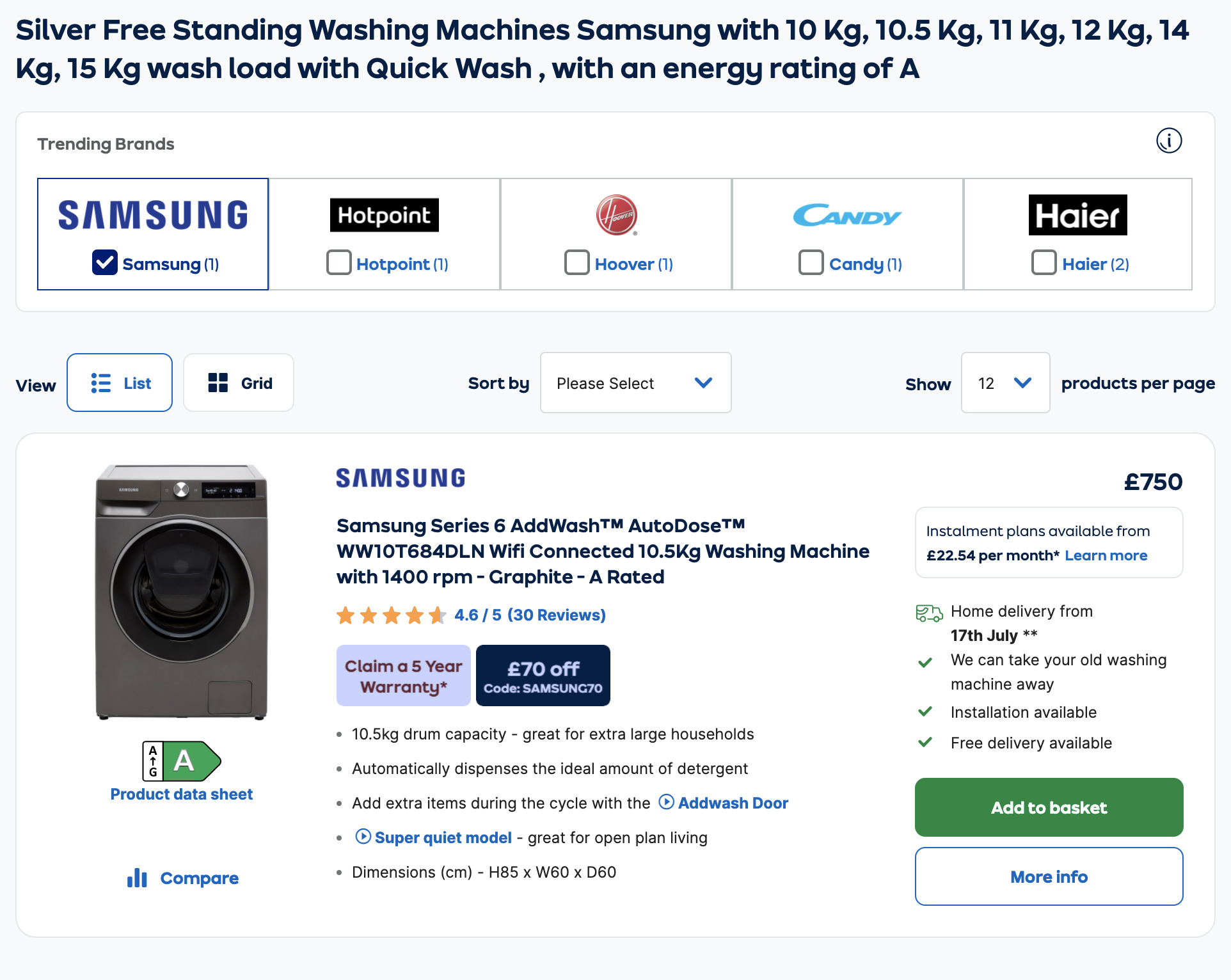 Thanks to the filters, the site has returned precisely the washing machine that suits that user’s needs.