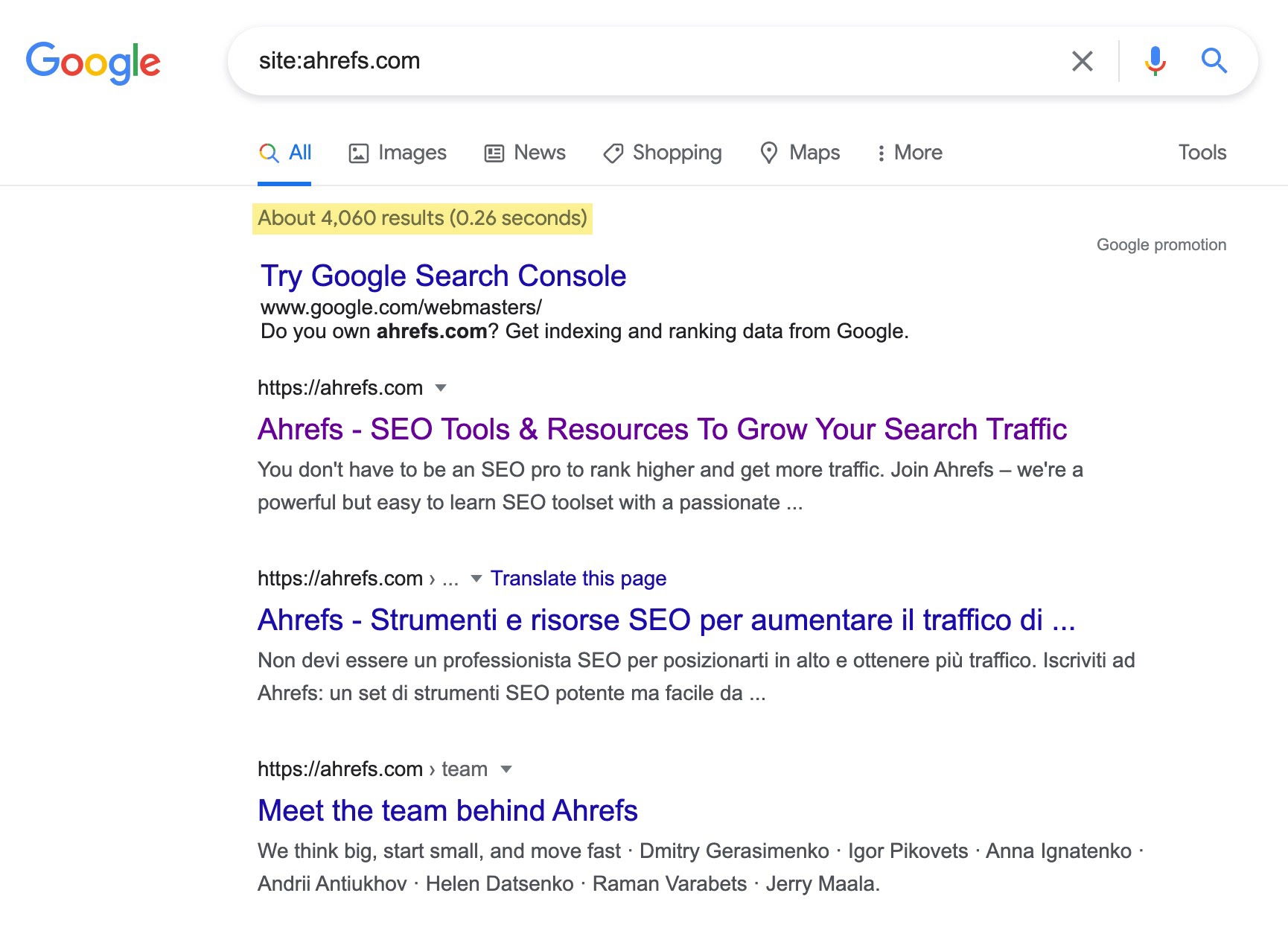 A great tactic to check for signs of index bloat quickly is to use the site: search operator. While not the most accurate way, it’s quick and easy to do.