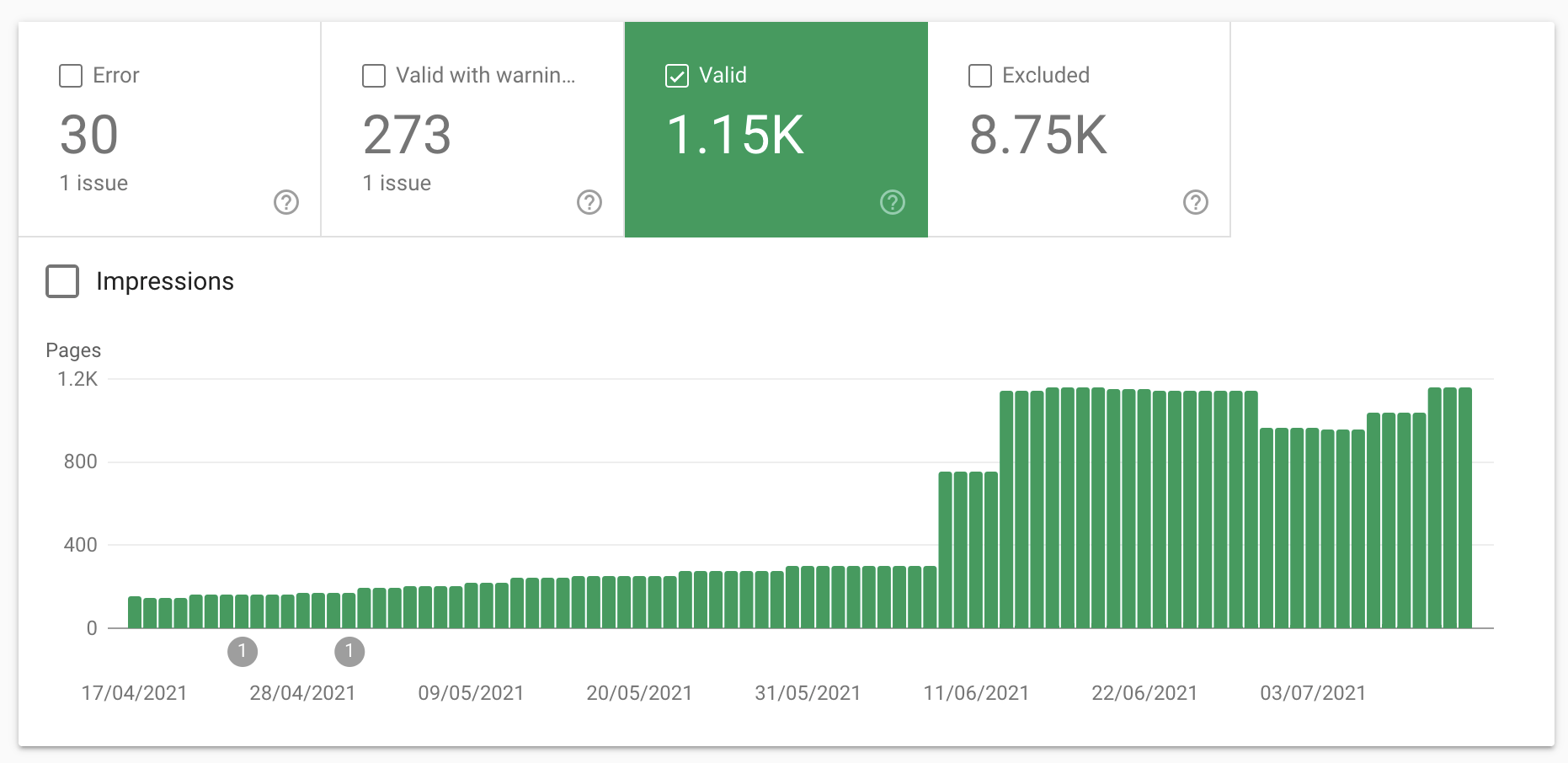 Just head to the ‘Coverage’ report within GSC and select ‘Valid’ on the chart for a more accurate figure on the number of pages Google has indexed: