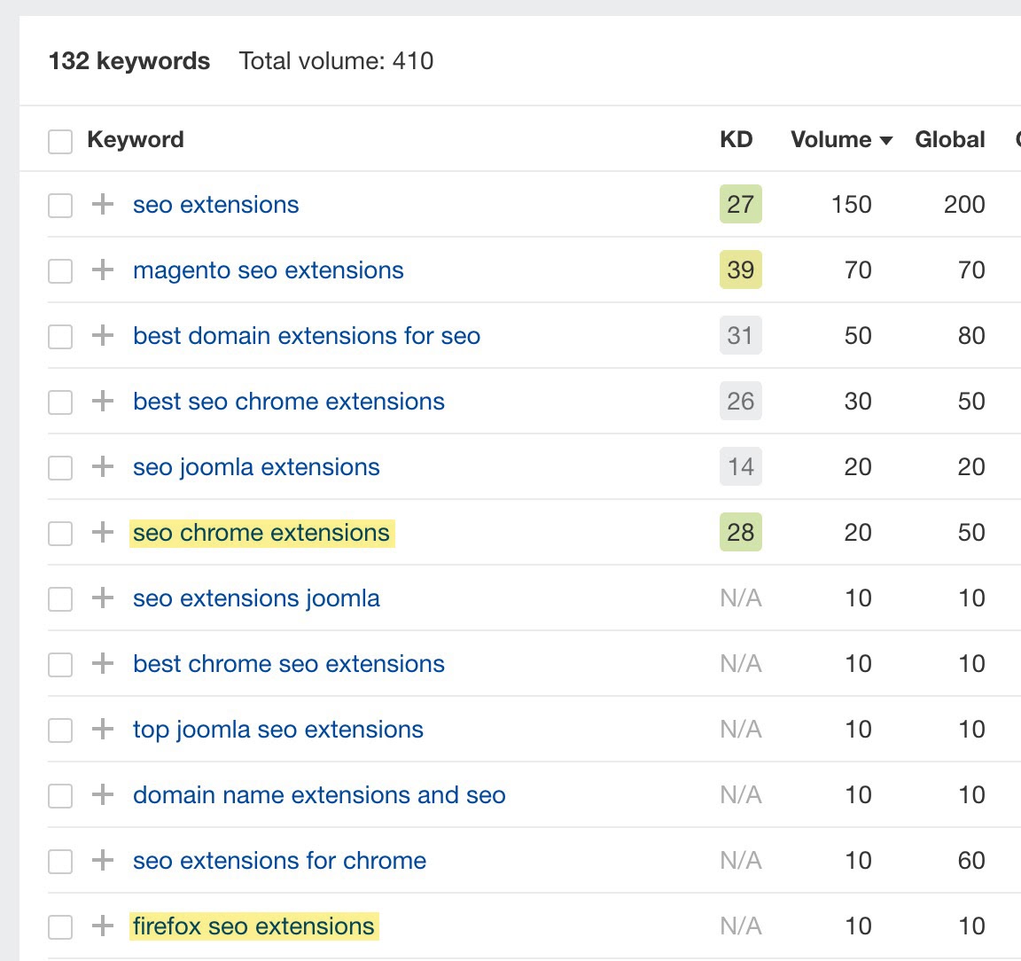 For example, there are filters for ‘Firefox’ and ‘Chrome’ on my SEO browser extensions page. Both of these pages have some search potential.