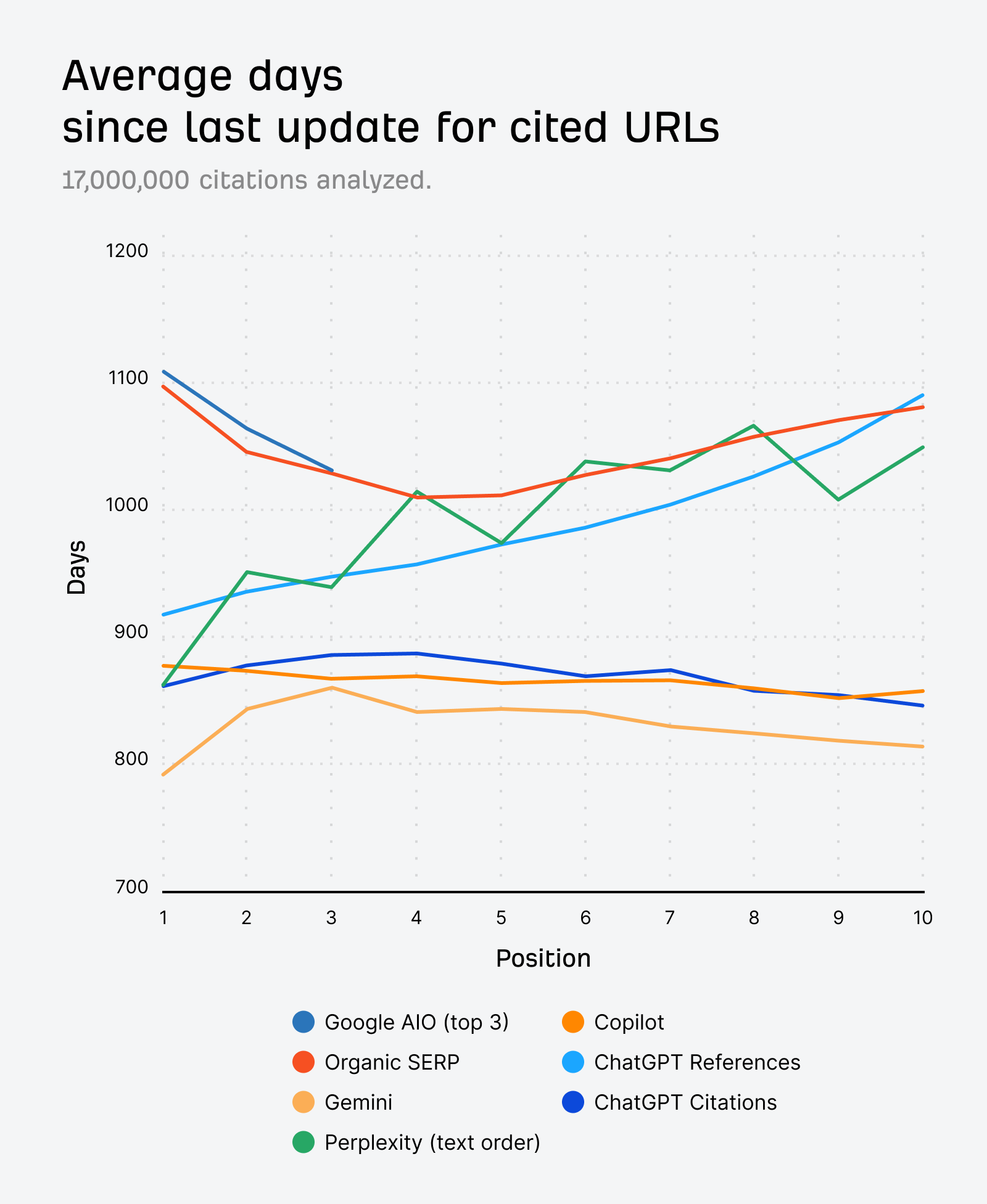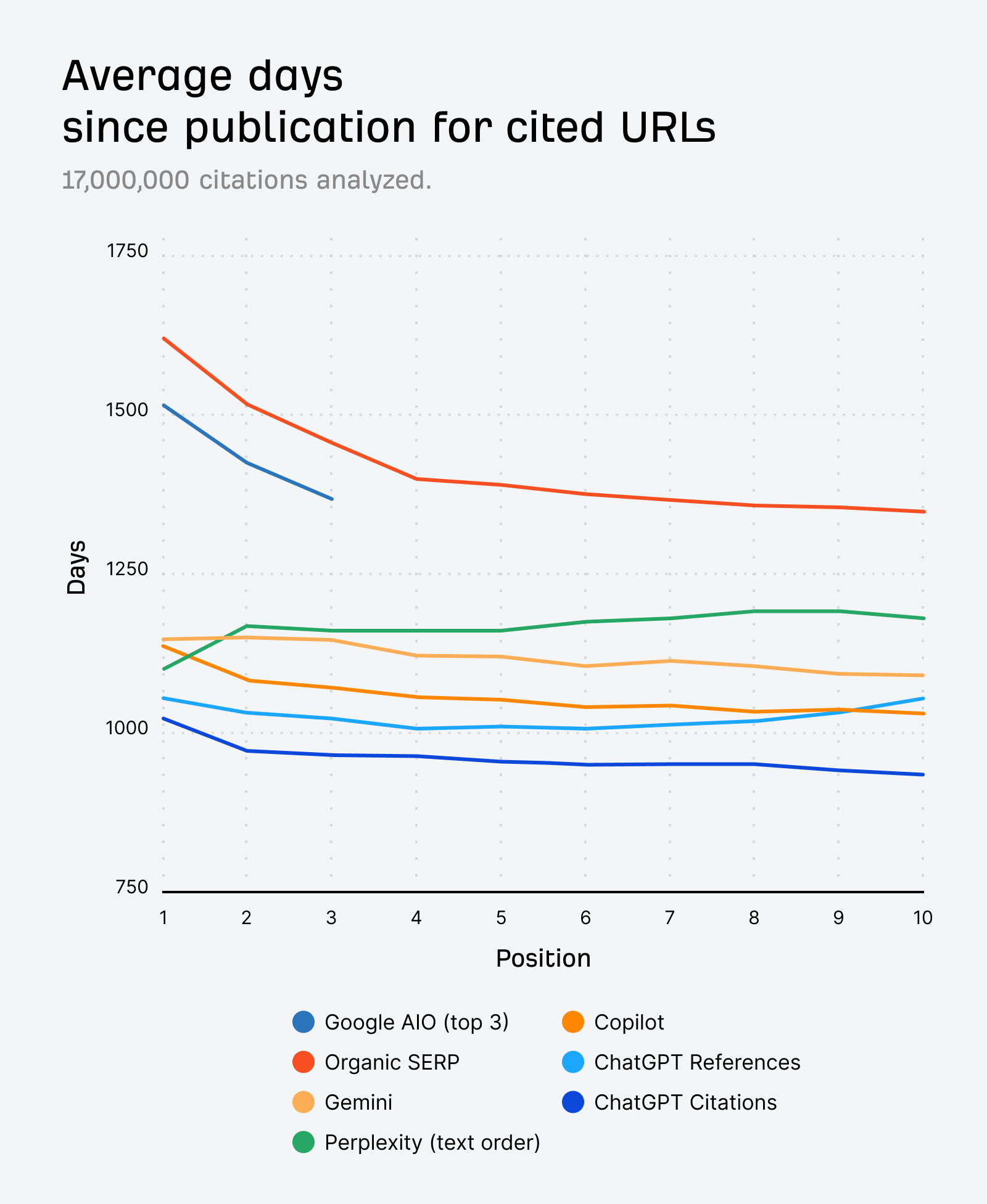 If we average the age of cited URLs in all positions across ChatGPT, Perplexity, Copilot and Gemini, we get an average time since publication of 1064 days, or 2.9 years. For the organic SERP, the average time since publication is 1432 days, or 3.9 years—one full year older.