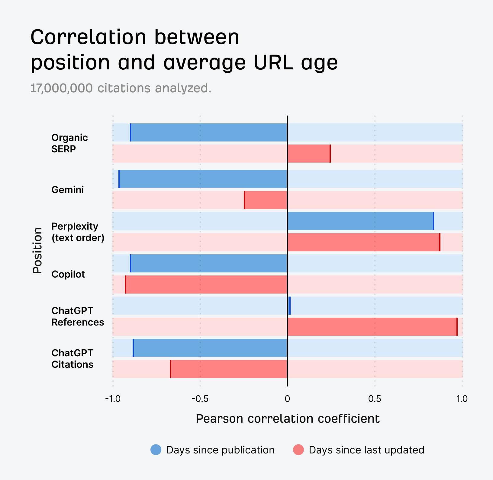 Most platforms show a negative correlation between citation and content age, suggesting that older content is usually cited first (and ranked higher in the organic SERP).