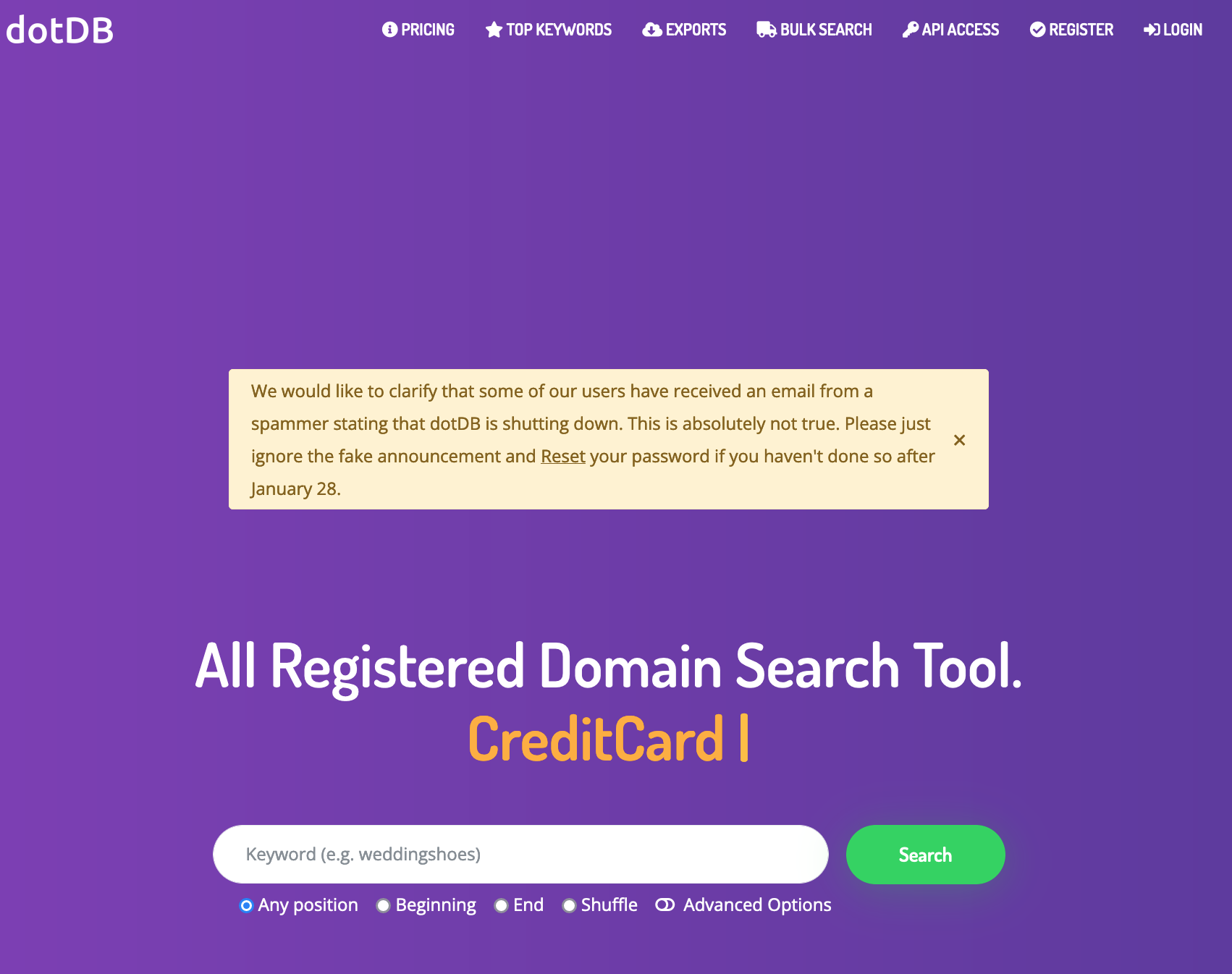 dotDB is NOT shutting down. Emails were sent out, apparently, to dotDB registered users claiming that dotDB was shutting down. However, a statement on the dotDB website (see above) claims that a spammer sent out those emails claiming that the website and service was shutting down. dotDB is the most advanced tool for researching domain names, according to their website. I actually use the tool regularly and recommend it.