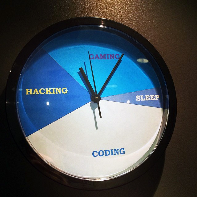 Here is an old photo from the old Google Kirkland, Seattle office, of a clock on the wall. It is a coder clock that shows how much of the day a coder sleeps, games, hacks and codes.