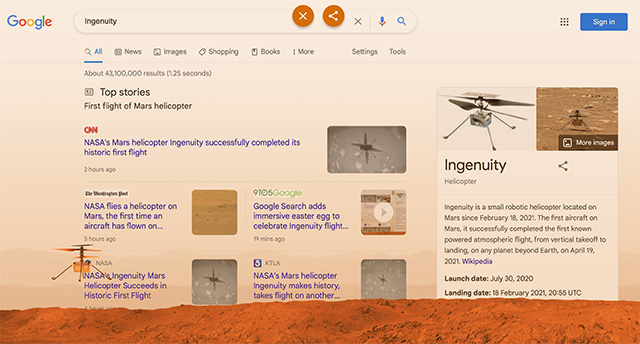 Search for [Ingenuity] in Google Search and you will get this super fun easter egg of the the robotic helicopter flying around Mars. The Ingenuity successfully completed the first known powered atmospheric flight, from vertical takeoff to landing, on any planet beyond Earth, on April 19, 2021.