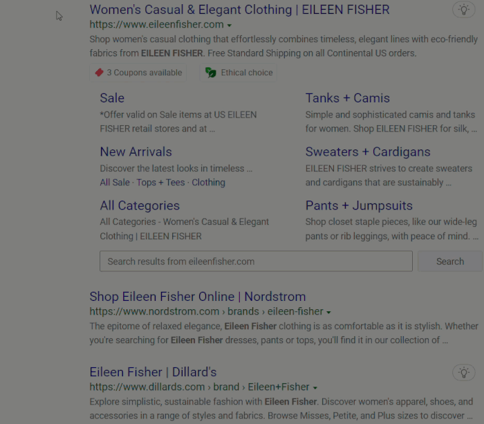 Let’s say you are shopping for a new outfit for a girls’ night on the town. Or maybe you are just window shopping for some back-to-the-office fashions. A search for the Eileen Fisher website on Bing reveals that some coupons are available, even before you click to enter the site. No need to do a separate search for a code. And if you decide to click in and do some shopping, the coupon will be automatically copied and applied to your purchase. All of this is made possible by quick and easy annotation links found within your search results. This feature is now available across the US, UK, Canada, Australia, Germany, and France.