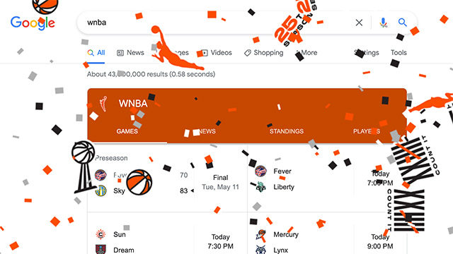 If you do a search for WNBA on its 25th anniversary you will get a nice easter egg in Google to celebrate. Try it out on you desktop browser or mobile browser by searching for [wnba].