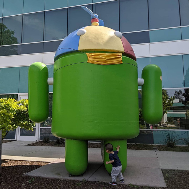 I keep finding new photos of the Android statues at the Google offices in Mountain View, California. It seems like they are all masked. We had a red masked and blue masked and now here is a yellow masked Android statue.